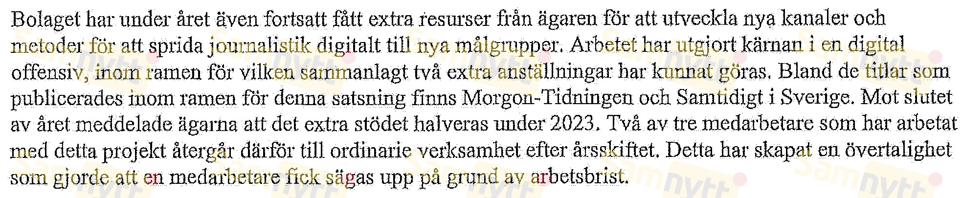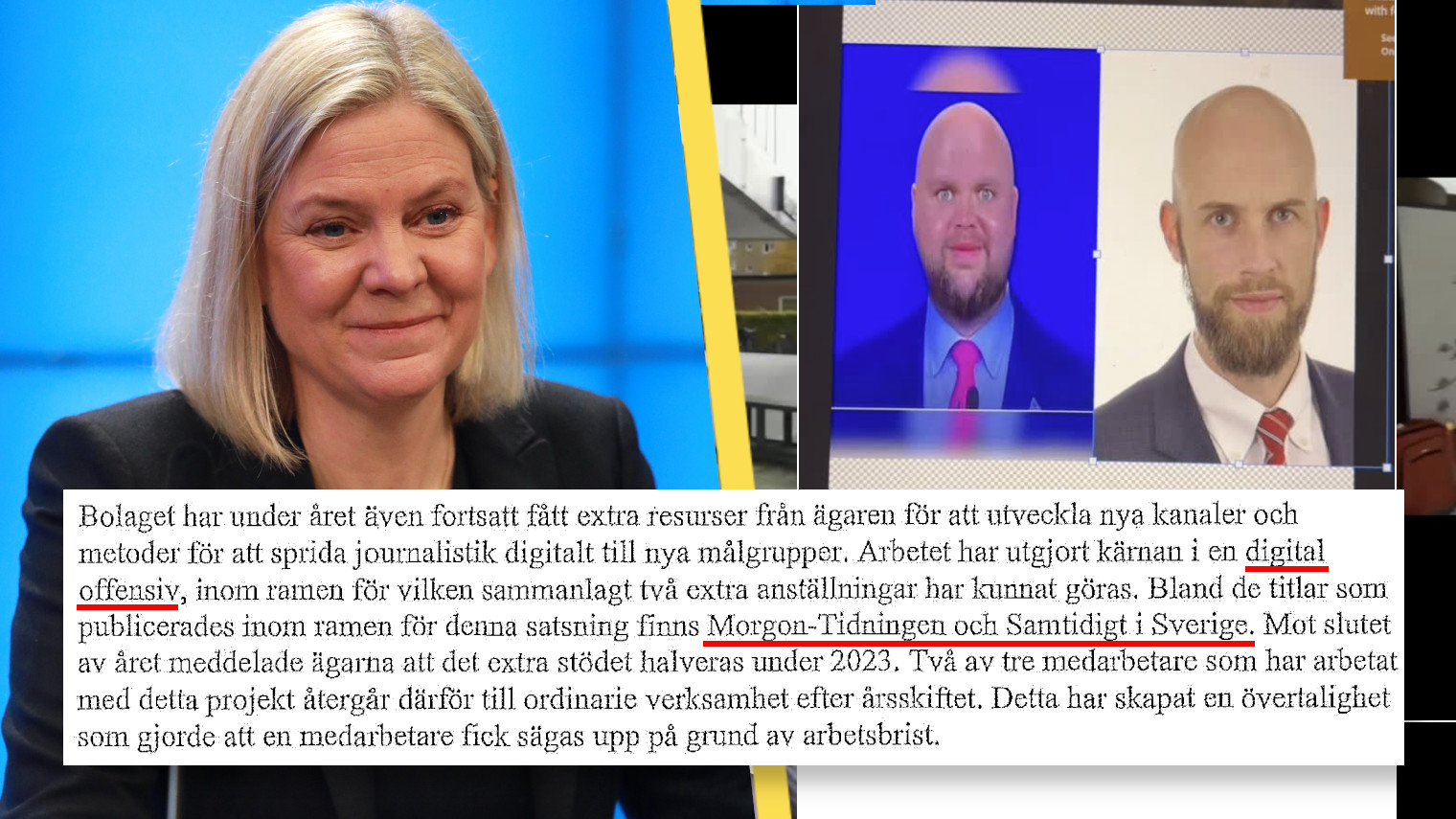 Ytterligare ett år senare, 2022, berättas i årsrapporten mer precist vad den digitala offensiven utgörs av: ”Bland de titlar som publicerades inom ramen för denna satsning finns Morgon-Tidningen och Samtidigt i Sverige”, står att läsa i klartext i rapporten.