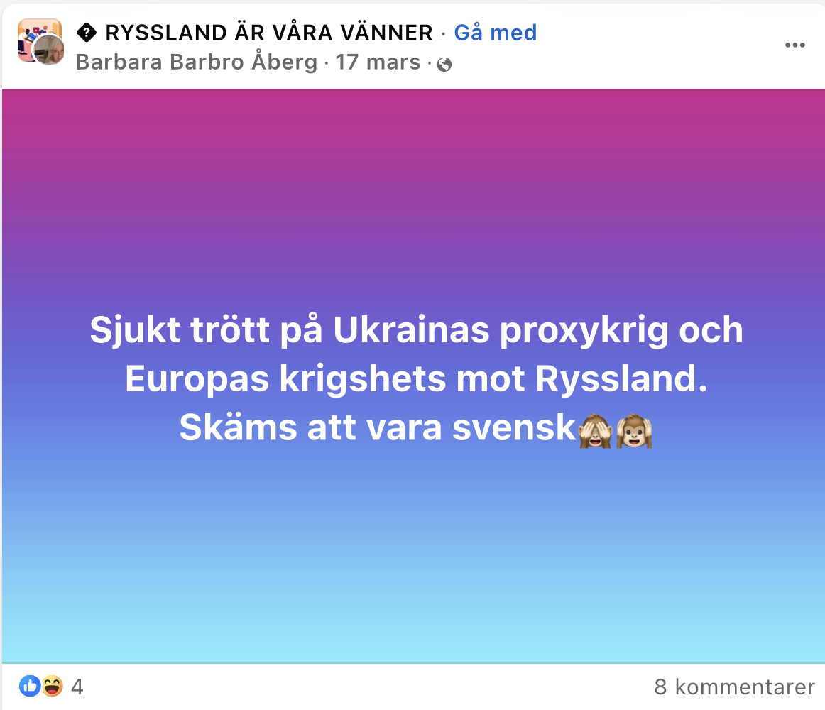 Det är bland annat i den öppna Facebookgruppen ”Ryssland är våra vänner” med sju medlemmar som Barbara Åberg har skrivit: