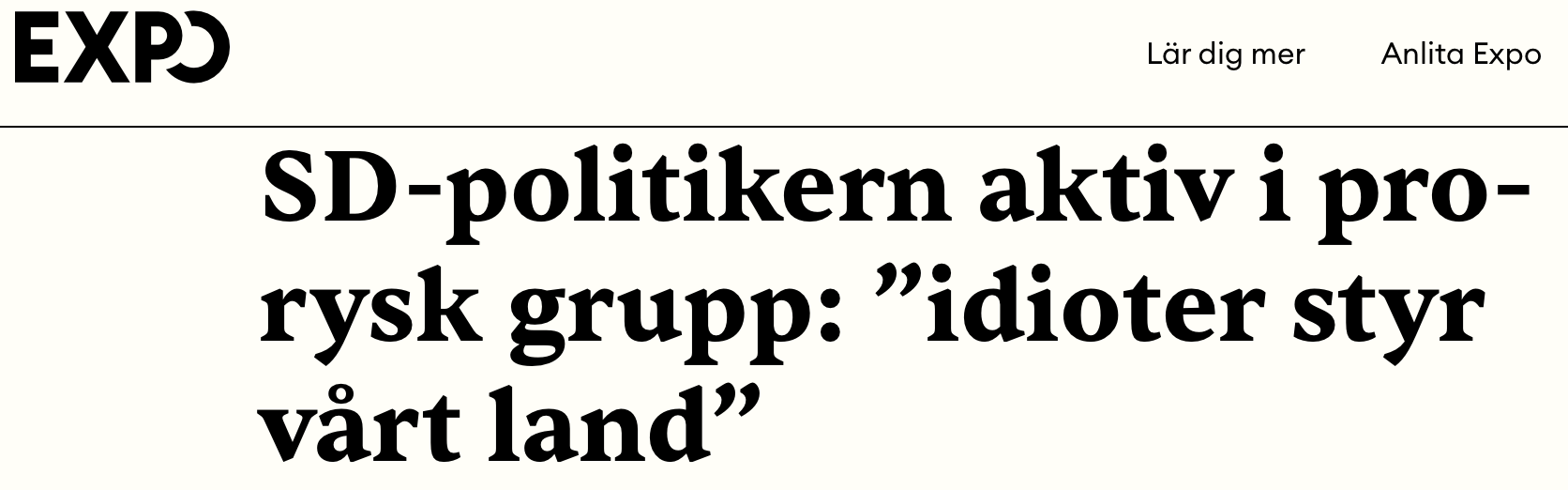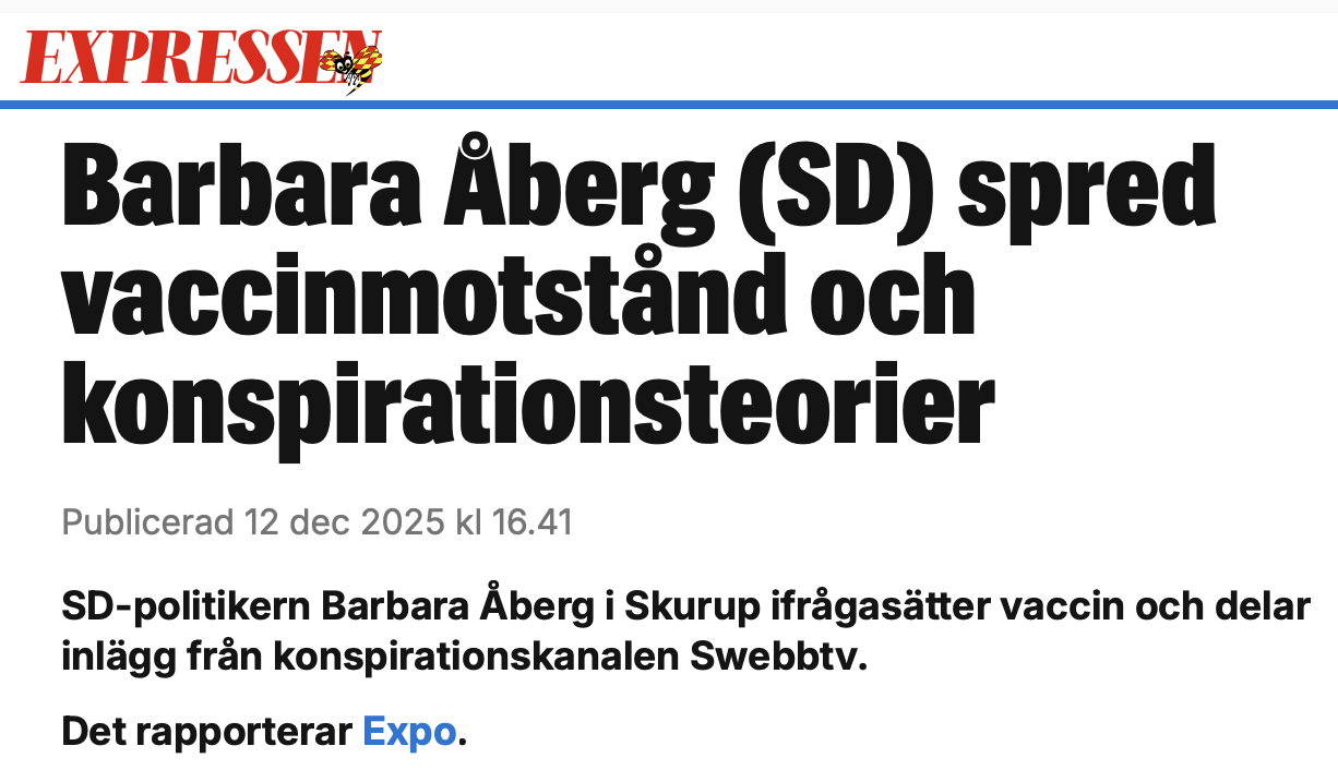 Expo rapporterar att SD-politikern har delat inlägg från “den högerextrema kanalen Swebbtv som är en central hubb i Sverige för vaccinmotstånd, pro-ryska talepunkter och desinformation”.
