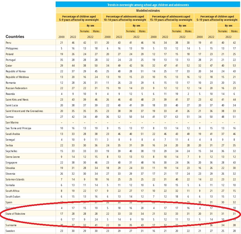 Övervikten gäller inte enbart barn. Med hjälp av data från Global Obesity Observatory och relaterade näringsprofiler noteras att om ”Palestina” rankades som ett land skulle det hamna bland världens mest överviktiga samhällen, med vuxenfetma på 40 procent, långt över Israels cirka 23 procent.