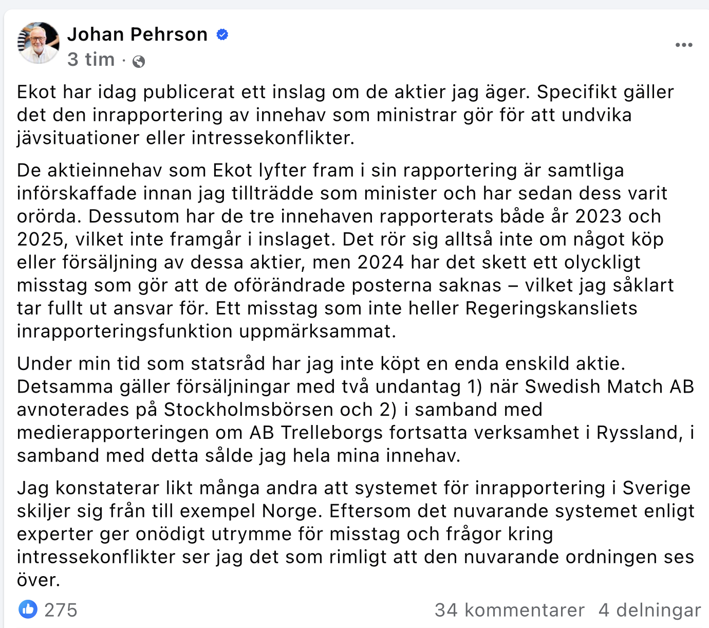 Liberalernas partiledare och utbildningsminister Johan Pehrson avgick plötsligt på måndagen. Mitt i mandatperioden förklarade han att han ‘uppfyllt sin politiska plikt’ och uttryckte stolthet över att ha gjort Liberalerna till ‘en relevant aktör’. På tisdagen uppmärksammades det dock att Pehrson undvikit att svara på Sveriges Radios frågor om sitt hemliga aktieinnehav.