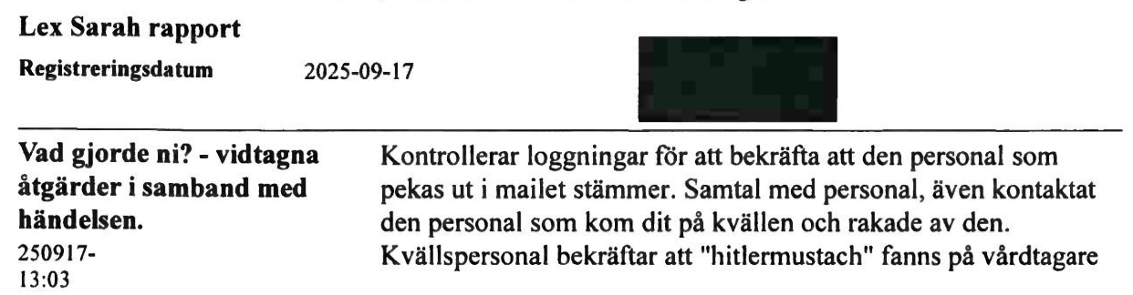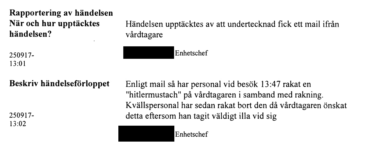 – Personalen har uppgett att denne inte rakade någon Hitlermustasch som omsorgstagaren påstår eller har upplevt.