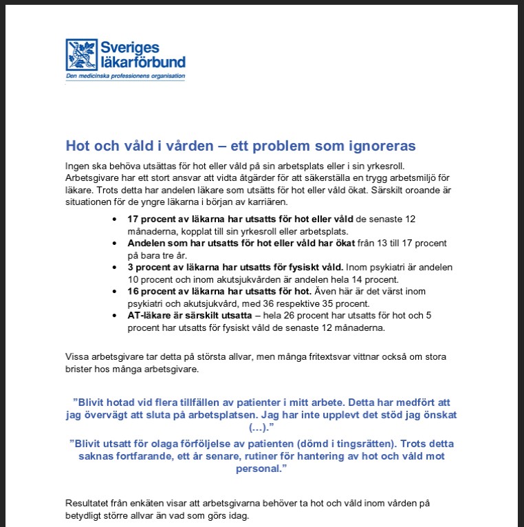 Läkarförbundets nya arbetsmiljörapport visar en utveckling där hot och våld mot läkare har ökat de senaste åren. 17 procent av landets läkare uppger att de utsatts under de senaste tolv månaderna. 2022 låg motsvarande andel på 13 procent.