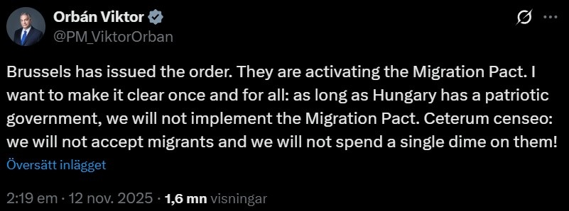 ”Jag vill klargöra en gång för alla: så länge Ungern har en patriotisk regering kommer vi inte att genomföra migrationspakten”, skriver Viktor Orbán i ett inlägg på X: