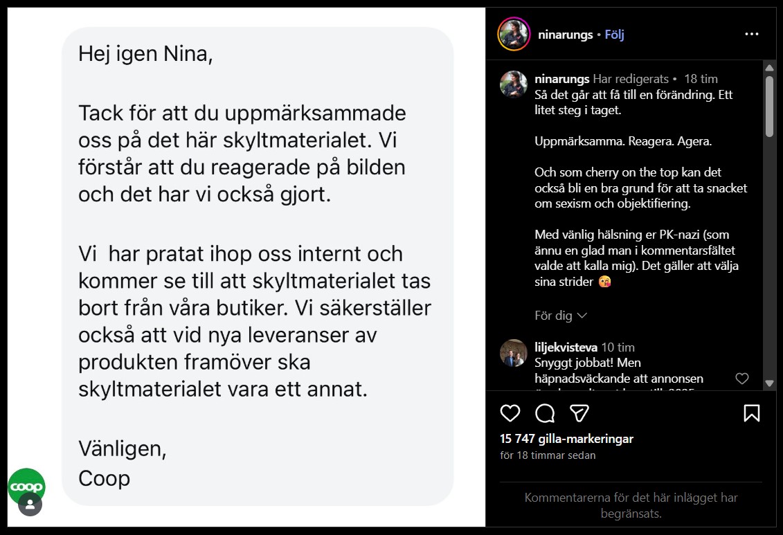 Då kriminologen och feministen Nina Rung gick in på Coop möttes hon av en bild av en lättklädd kvinna i en reklam för iskaffe. I inlägg på sociala medier rasar hon över bilden och nu backar Coop.