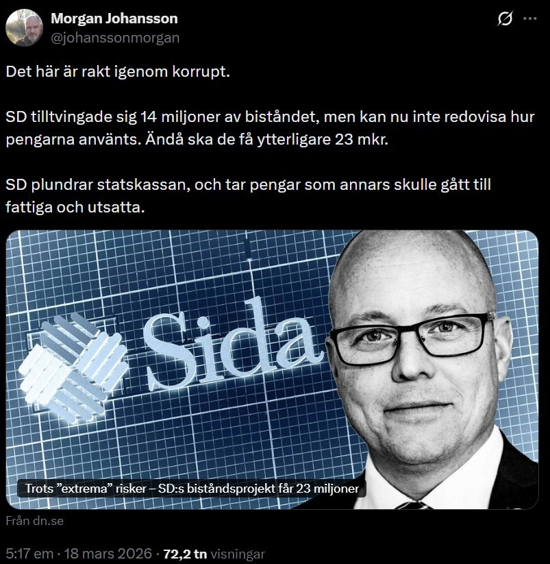 Under rubriken ”Trots ’extrema’ risker – SD:s biståndsprojekt får 23 miljoner” skriver DN att regeringen och Sverigedemokraterna lovat att städa upp i det svenska biståndet vars pengarullning visat sig vara allt annat än effektivt. Man har också varnat för korruption och krävt hårdare kontroller. Vissa menar också att Sida spelat ut sin roll och bör avvecklas.