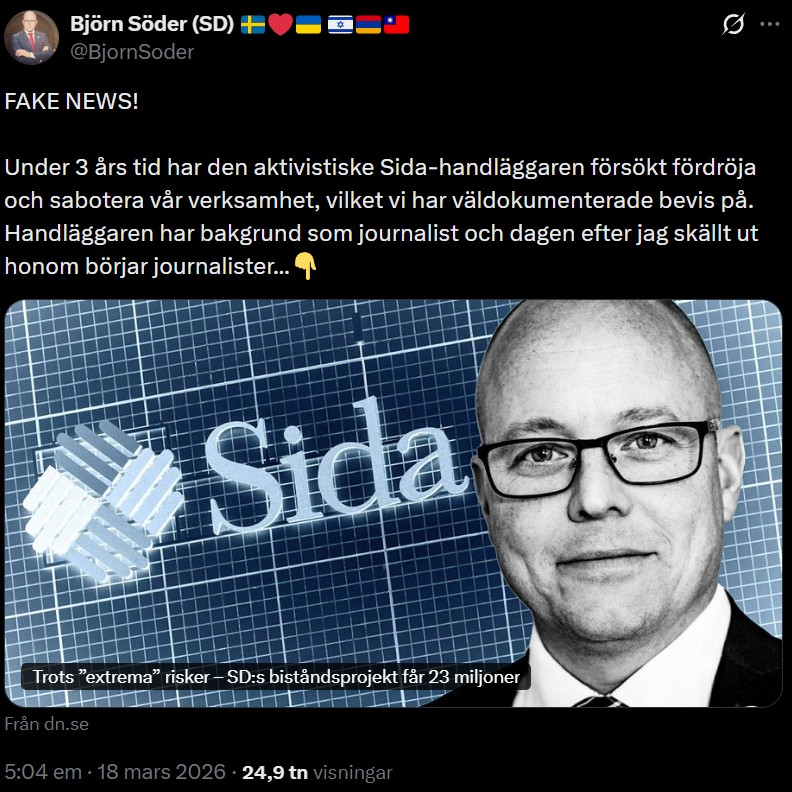 ”Fake news” ryter Söder till på sociala medier och utvecklar sitt resonemang mer i detalj och avslöjar hur det faktiskt gått till. Där skriver han att den aktivistiske Sida-handläggaren under tre års tid gjort sitt yttersta för att fördröja och sabotera Hepaticas verksamhet, något man har väldokumenterade bevis på.