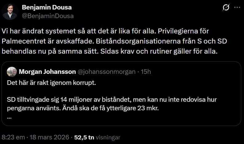 Ytterligare en person som kritiserar Morgan Johansson och hans utspel är bistånds- och utrikeshandelsminister Benjamin Dousa (M). Dousa konstaterar att man ändrat systemet så det nu är lika för alla – en situation Socialdemokraterna är ovana vid.