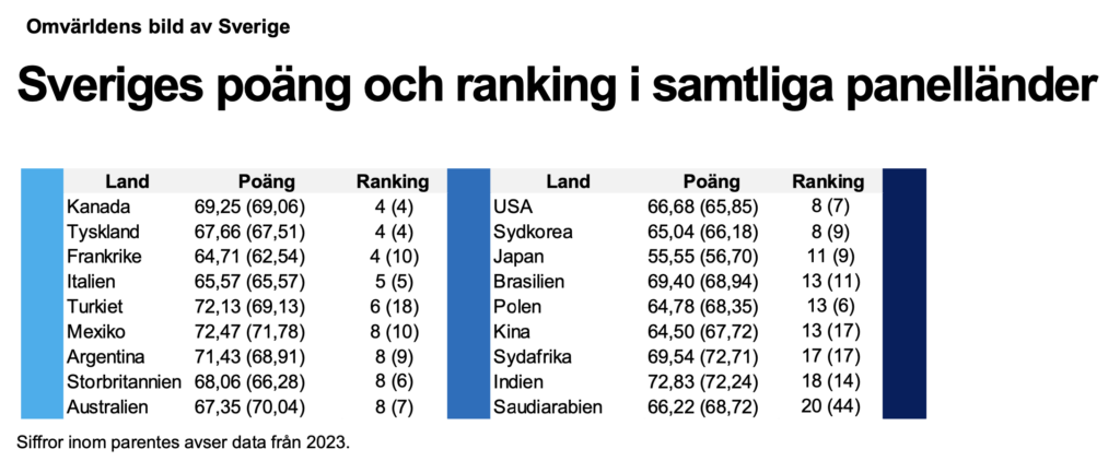 I årets upplaga av Anholt-Ipsos National Brands Index (NBI) får Sverige se sig slaget av Japan, Tyskland, Italien Schweiz, Storbritannien, Kanada och USA. Sverigebilden i omvärlden är sämre än samtliga dessa länder.
