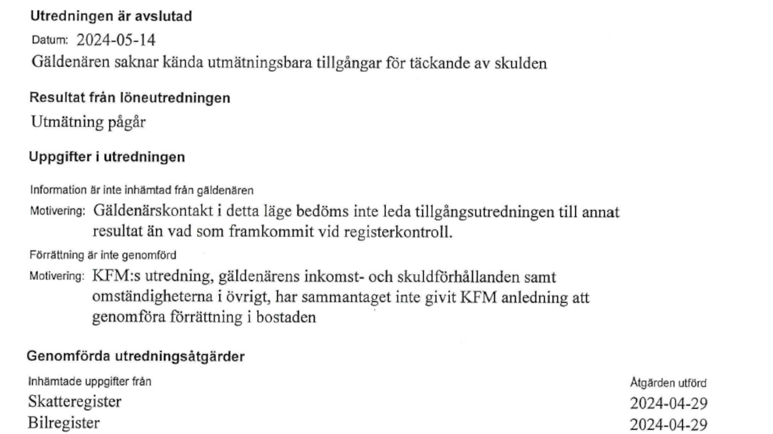 Enligt en utredningsrapport från Kronofogden, som Samnytt tagit del av, saknar den pensionerade kvinnan ”kända utmätningsbara tillgångar för täckande av skulden”. Det beslutas därför om utmätningar av hennes pension. Först med 472 kronor i månaden. Sedan 1591 kronor. Och slutligen 3016 kronor varje månad.