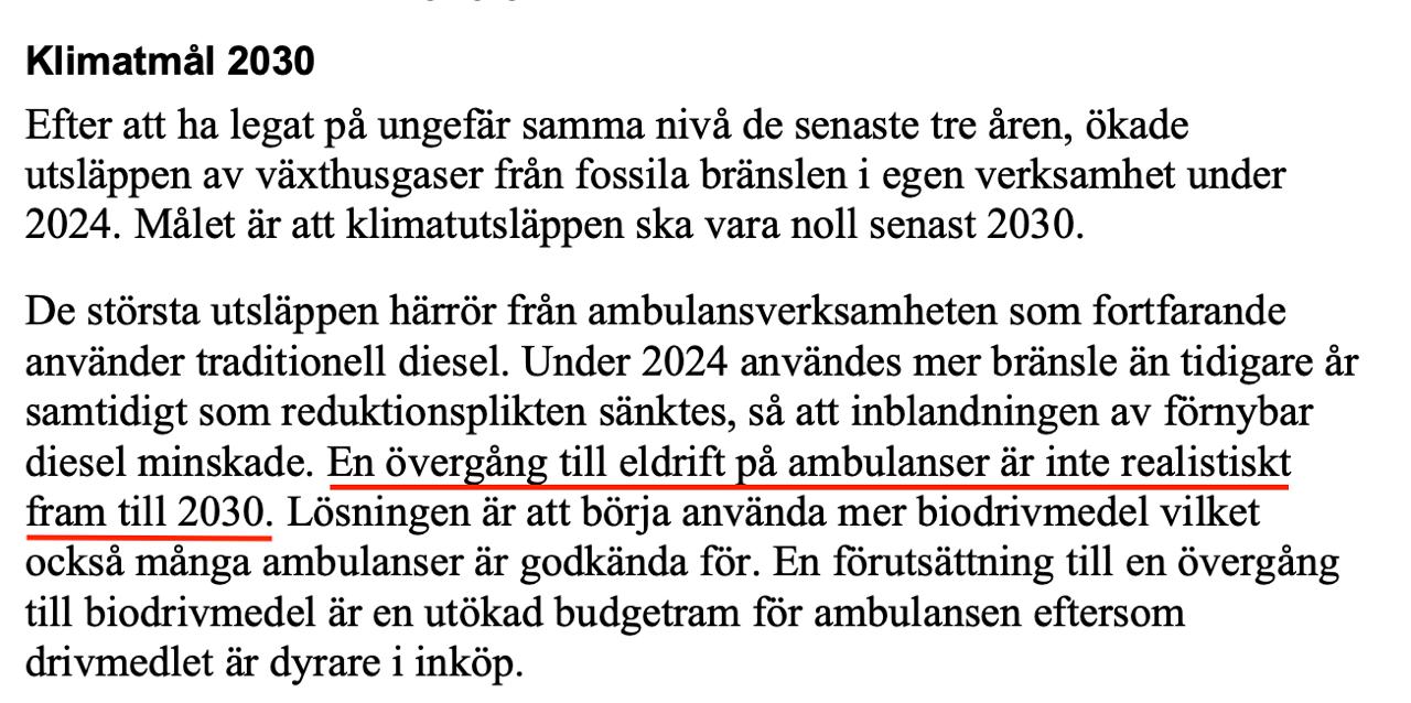 Samtidigt anges tydligt i klimatbokslutet att det dels är orealistiskt att på kort tid fasa ut de fossildrivna ambulanserna mot eldrivna. Man påtalar också att en övergång till biobränsle fordrar en utökad budget för verksamheten och att det inte finns ekonomiskt utrymme för det idag.
