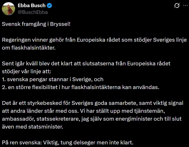 – Vår rätt att bestämma över flaskhalsavgifterna i Sverige är säkrad. Andra länder kommer inte kunna lägga beslag på dom. Det ät uttryckligen beskrivet, sa säger till statsradion.